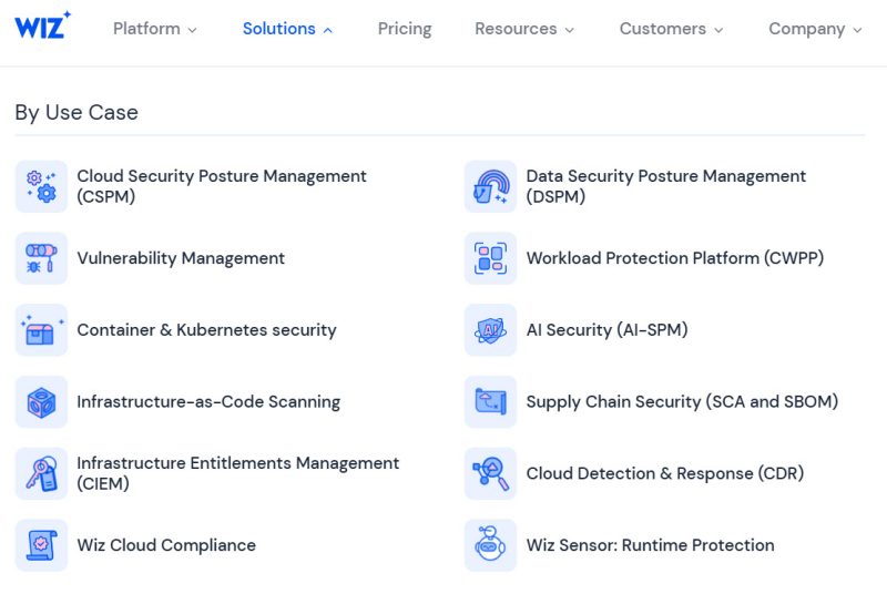 While we’re looking at the Wiz navigation, let’s hop over to the Solutions area. Here they list solutions to specific use cases (ICP-specific problems).